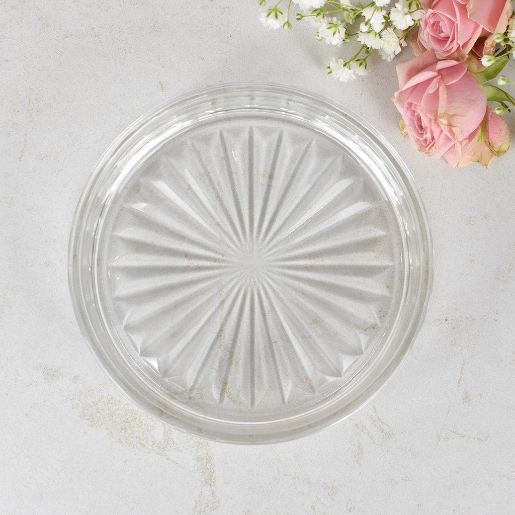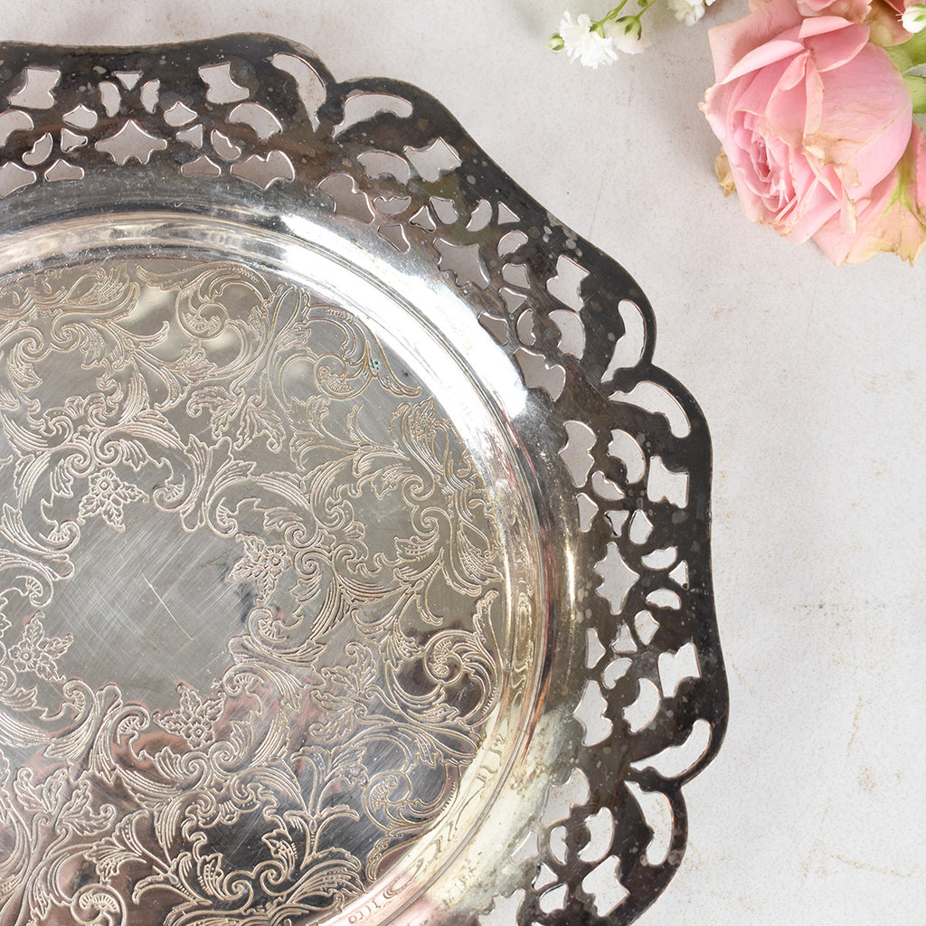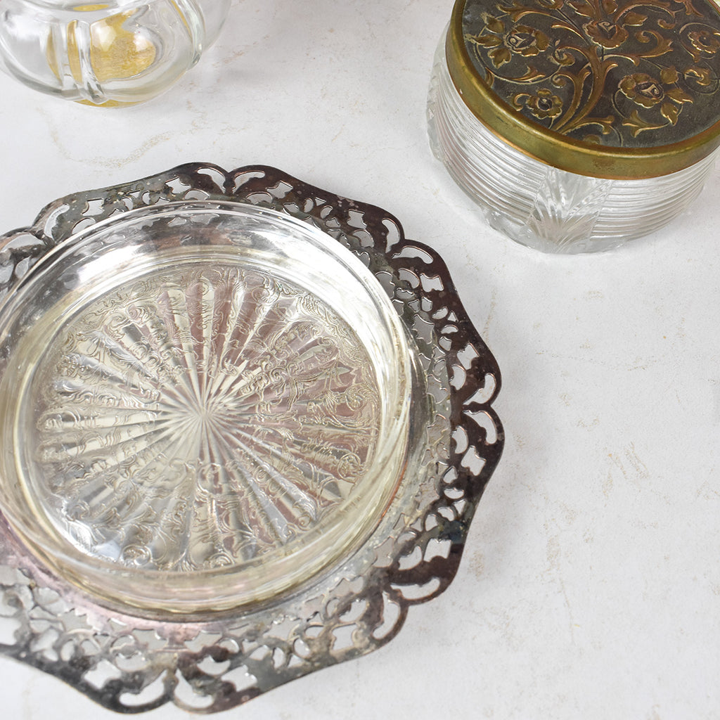 This beautiful glass and silver tray can be used in so many ways! Whether you use it as a candy dish, to hold your jewelry or keys, the possibilities are endless. The silver tray has a beautiful scroll-like design etched into the bottom and a decorative pattern around the rim.