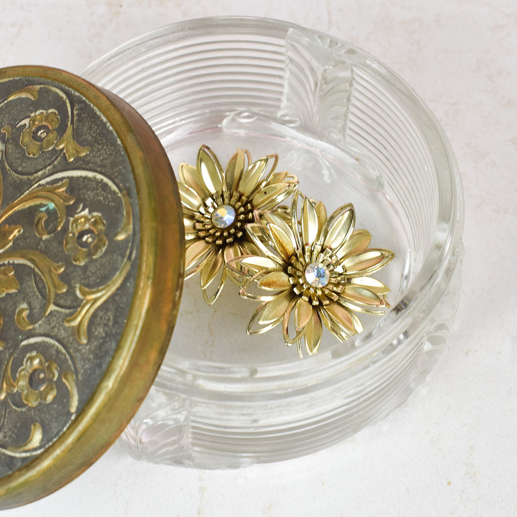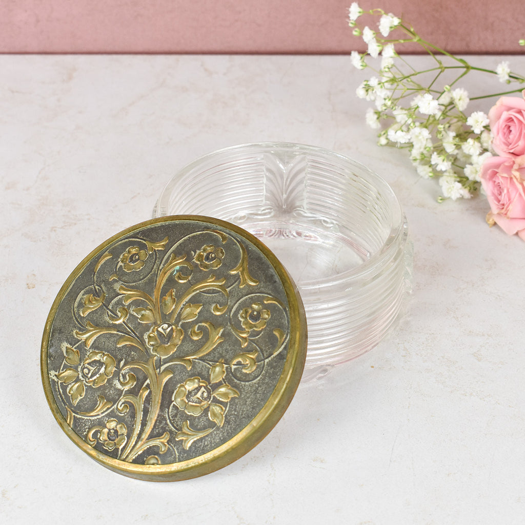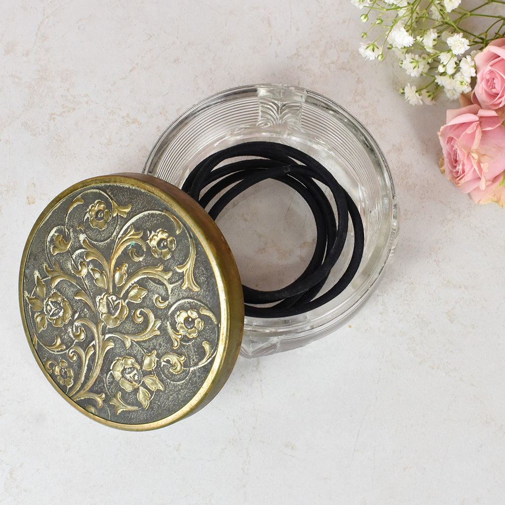 Keep your home organized with this charming vintage jar. The jar's lid has a beautiful floral design on top, while the jar itself has an Art Deco feel. It's a beautiful way to display and store your most loved items!