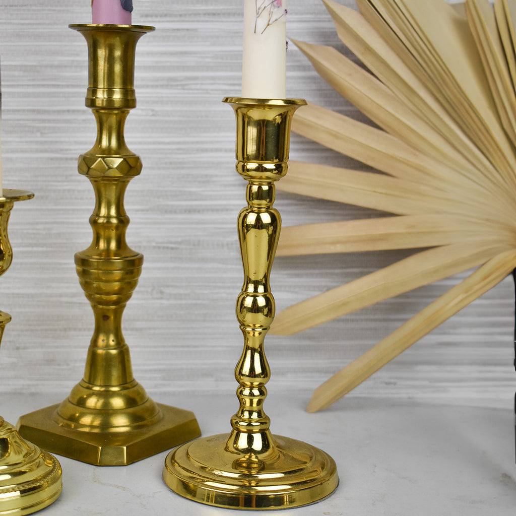 Add some charm to your home decor with this group of 3 brass candlestick holders. These can be displayed as is, or you can change out different candlesticks depending on the season. These look great displayed together on a table or shelf!