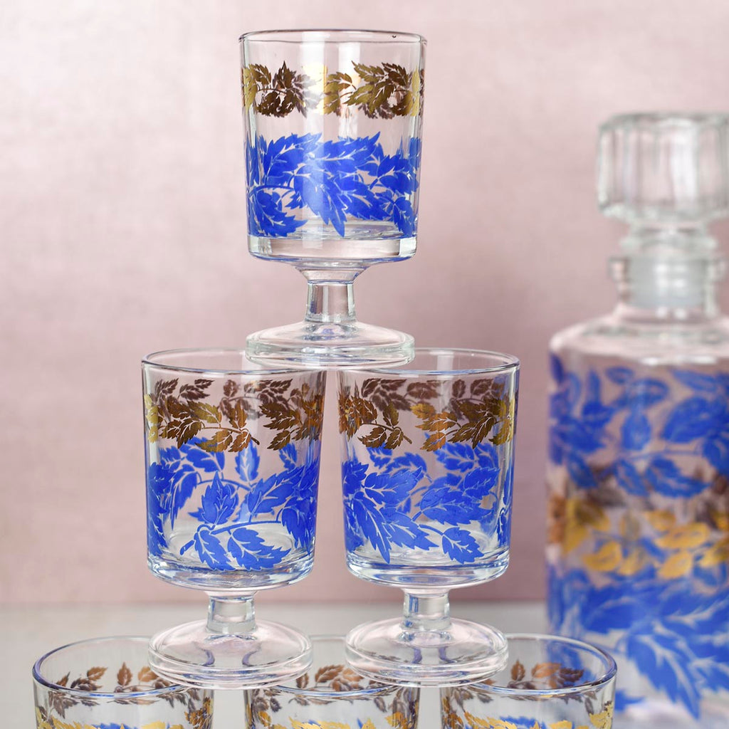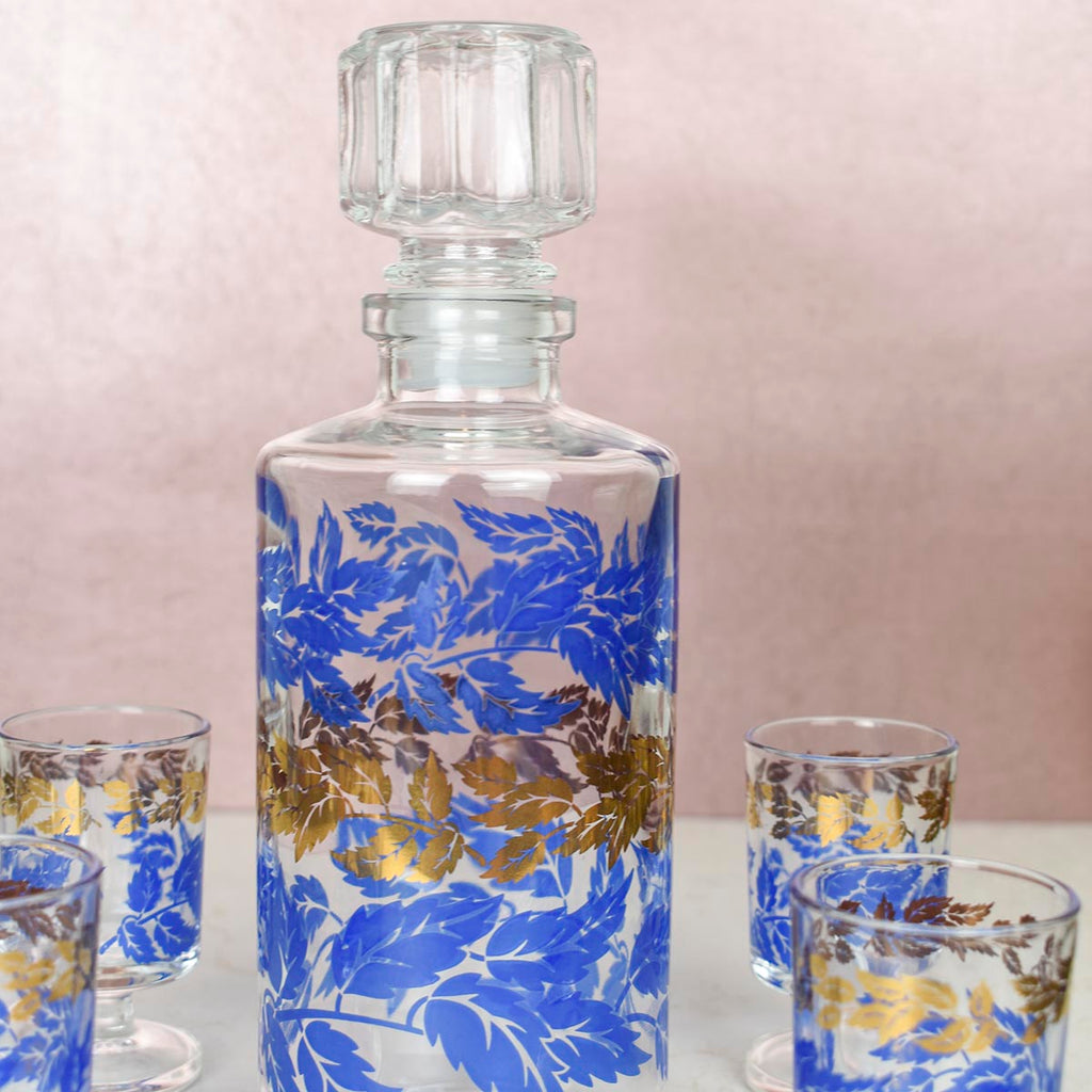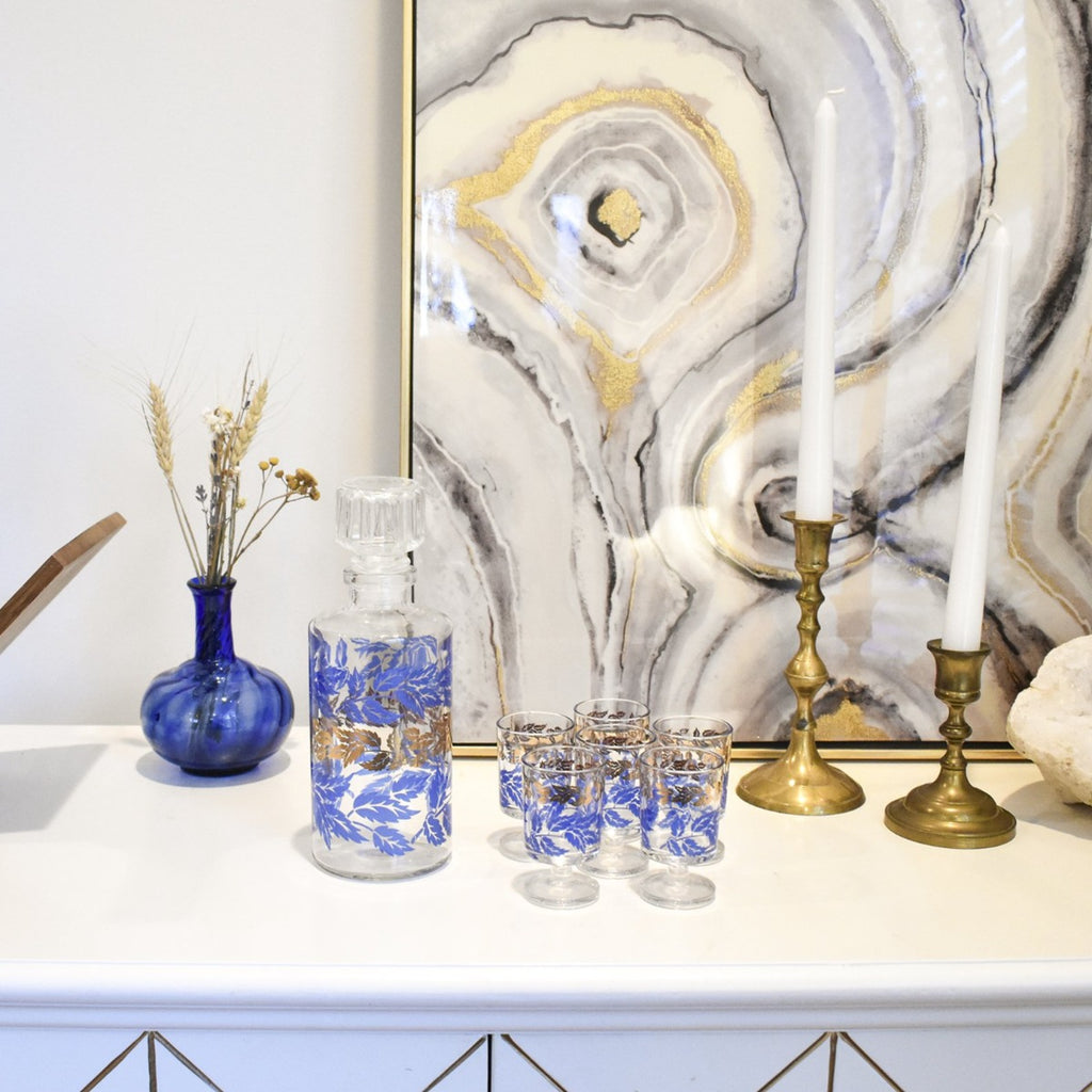 This vintage French decanter and glass set is the perfect addition to your bar! Set includes one small decanter and 6 small shot glasses. Has a stunning, vivid cobalt and gold leaf pattern across all pieces. A great find for anyone wanting to add a little pop of retro blue to their bar cart!