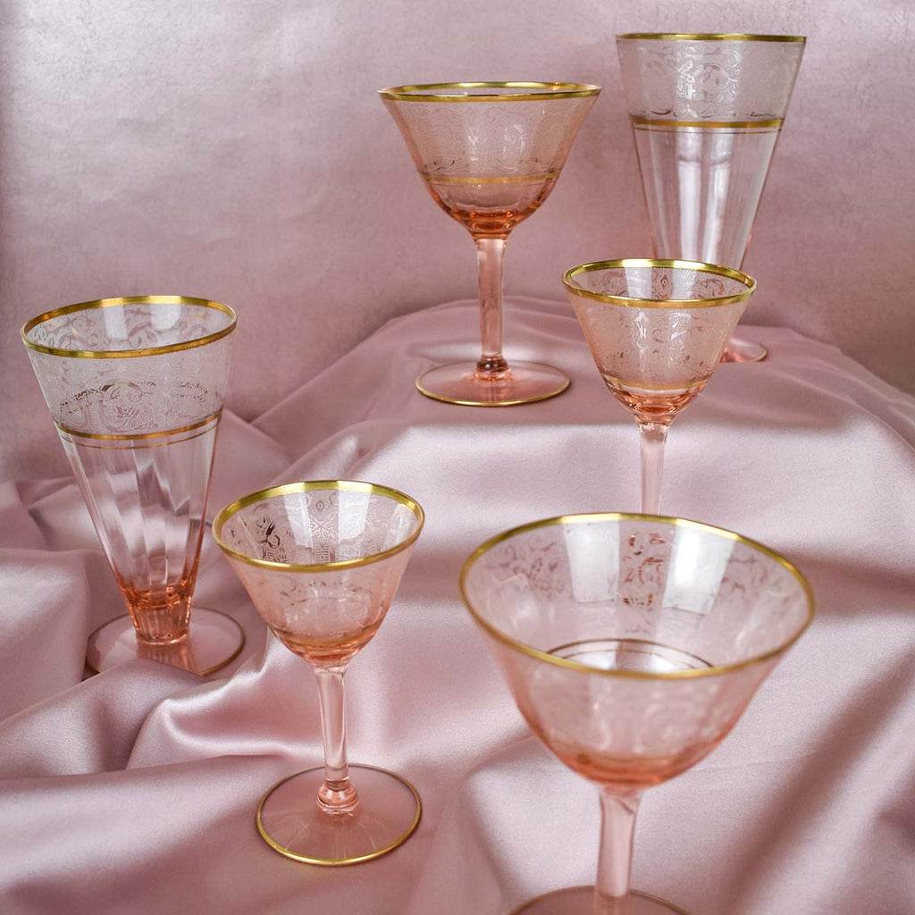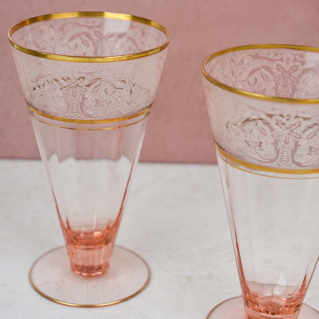 These gilded footed tumblers are from the early 1900s and quite the stunners! Perfect for any occasion, you'll set the tone for the night when you pull this set out. Has a beautiful etched pattern around the surface and a gold rim.