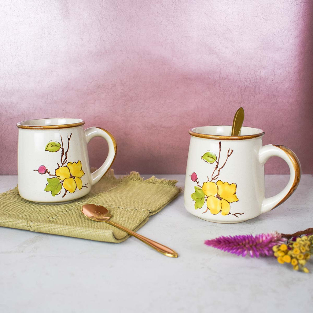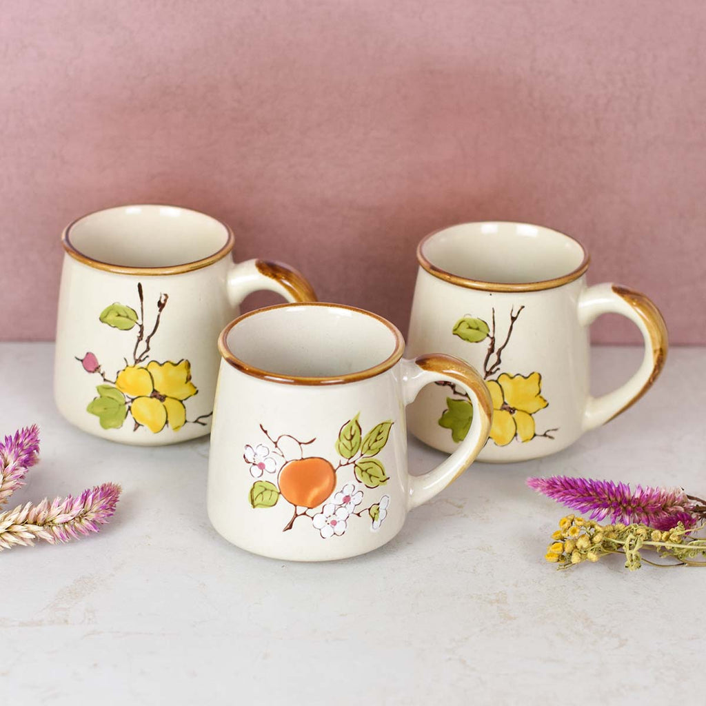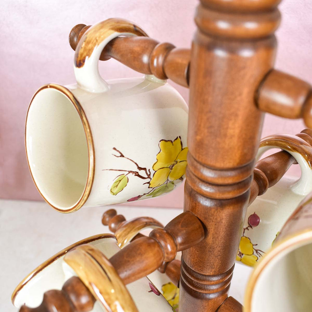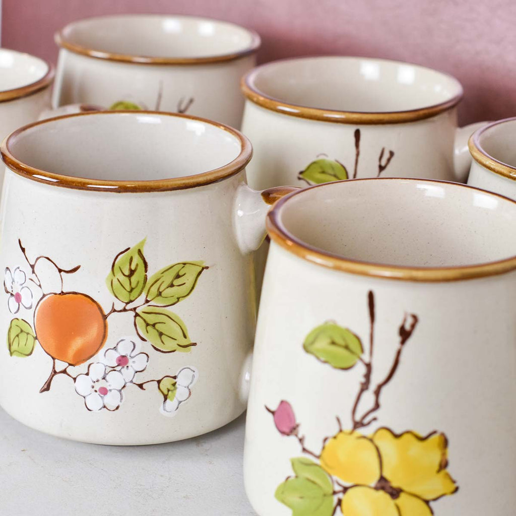 This beautiful set of mugs features florals on both sides - one special mug features an orange with blossoms. A funky collection to add to your kitchen! These will display beautifully on our wooden mug stand!