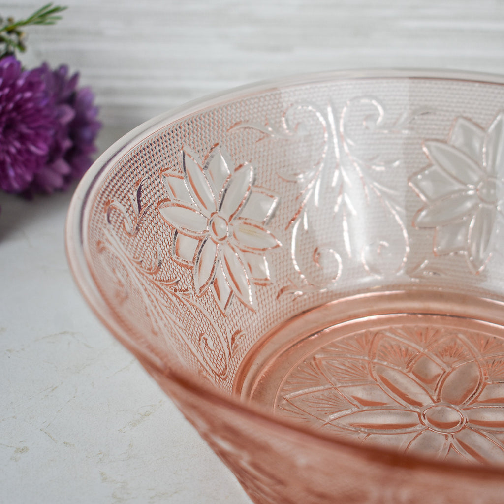 Ready for your dish to stand out at your next gathering? This stunning sandwich-patterned depression glass serving bowl will showcase your next masterpiece perfectly. The entire bowl is surrounded by gorgeous flowers and intricate swirls. No visible cracks or chips.