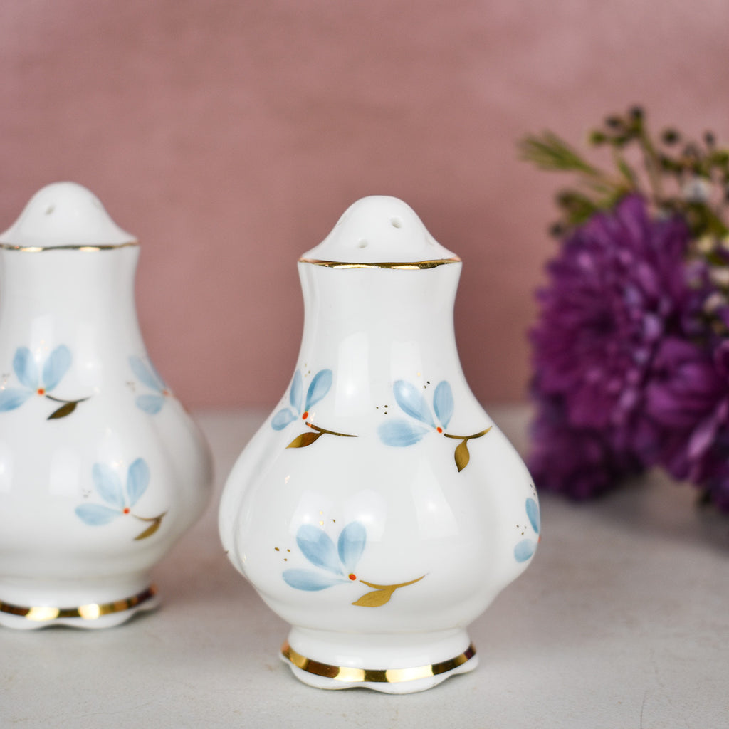 Pass the salt in style at your next dinner party with these sweet floral shakers. Small blue flowers with gold stems wrap around the entire shaker. This pair of shakers will look so cute sitting on your dining room table!