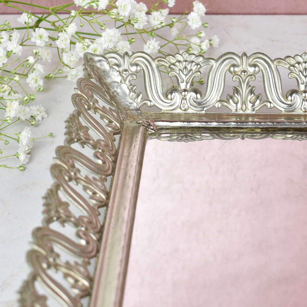 Add some vintage glamour to your vanity. This gorgeous silver rectangle tray has delicate floral detailing around the rim. It's the perfect way to display your trinkets and daily essentials in style.